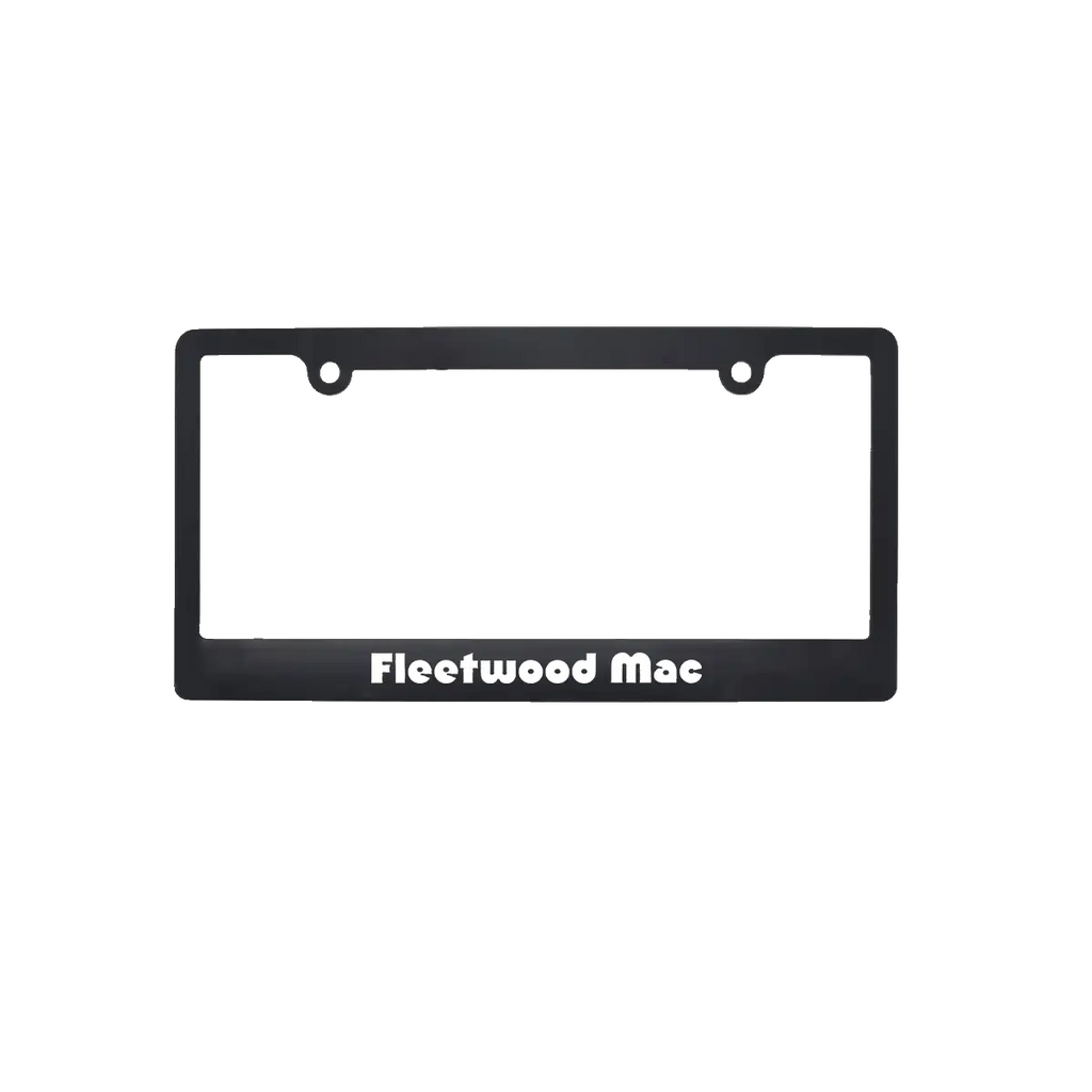Plastic, black license plate frame with white Fleetwood Mac logo.