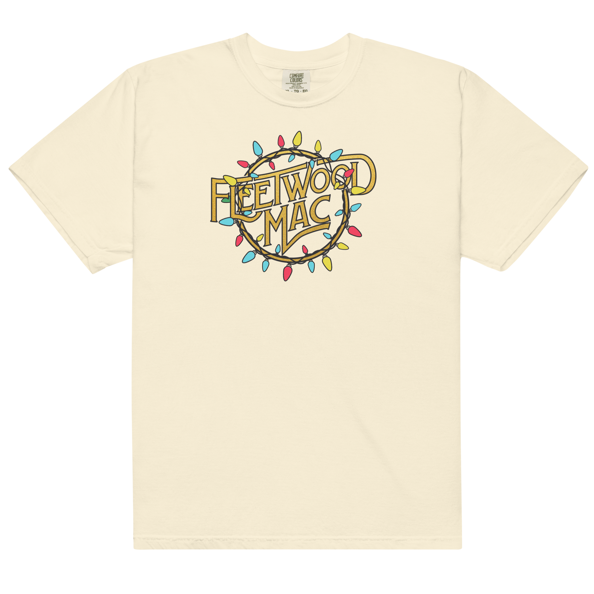 Ivory colored t-shirt with holiday lights logo design on the front. 100% ring-spun cotton.