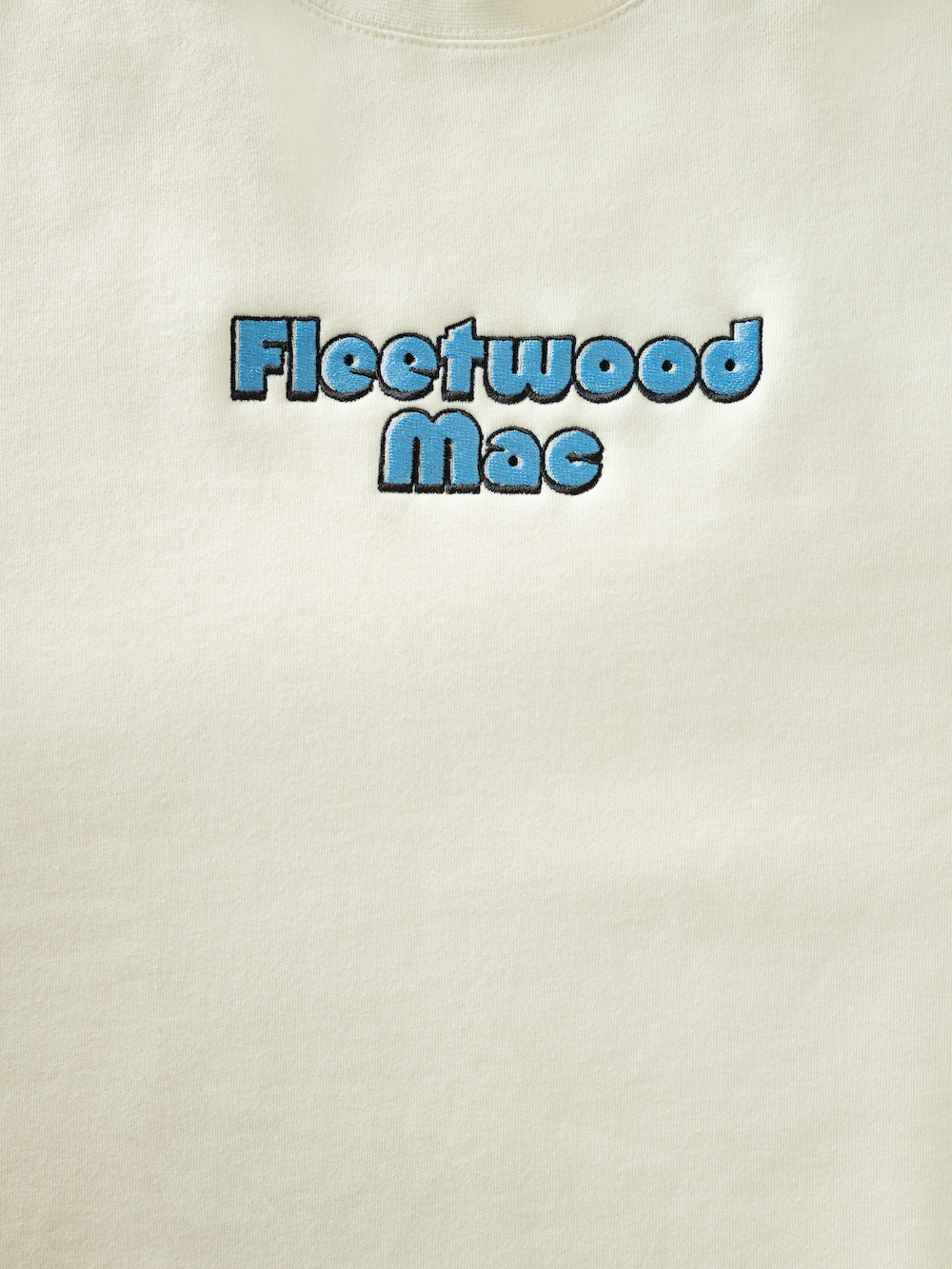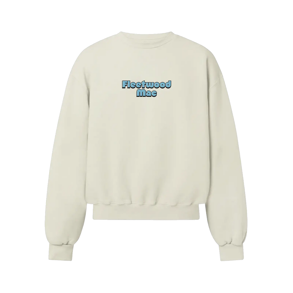 Off white colored, fleece, crewneck style sweatshirt with minimalistic Fleetwood Mac bubble logo embroirdered on the front.